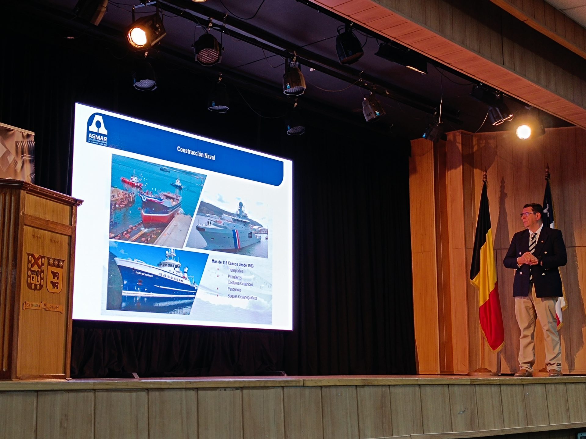 Asimismo, se contó con la participación de los especialistas Mario Maldonado y Rodrigo Rosenkranz, jefe de Taller de Calderas y cañerías y jefe de Sección Producción respectivamente, ingenieros con vasta experiencia en construcción y reparación naval. Maldonado introdujo su exposición con una breve historia a cerca del astillero chileno y sus capacidades. A continuación abordó el “Proyecto “Antártida I” -primer rompehielos que se construye en Sudamérica y el más importante en la historia de la construcción naval en Chile, desarrollado por ASMAR – y que nació por la inquietud de la Armada de Chile de contar con un buque para navegar en aguas antárticas y reemplazar a la antigua unidad AP 46 Almirante Oscar Viel, construido en Canadá el año 1969 y dado de baja el 2019.