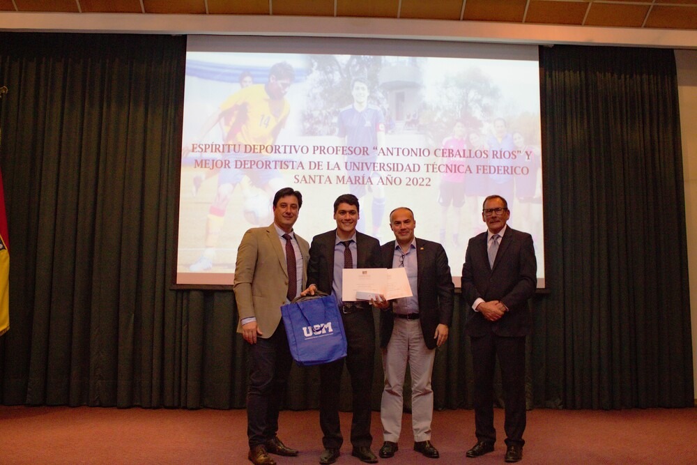Por último, entregó el premio Espíritu Deportivo “Profesor Antonio Ceballos Ríos” y Mejor Deportista de la USM 2022 al estudiante deportista Juan José Soriano, perteneciente a al seleccionado de fútbol, quien manifestó su alegría por el reconocimiento. “Es bastante grande el esfuerzo que se hace día a día, año a año, el estar en cada entrenamiento y, aparte, mantener los estudios en un nivel alto. Es difícil, complicado, pero es muy grato que puedan distinguirlo; estas cosas te marcan un antes y un después, muestran que estás haciendo las cosas bien y la idea es seguir en la misma línea en el mundo del trabajo”, comentó.