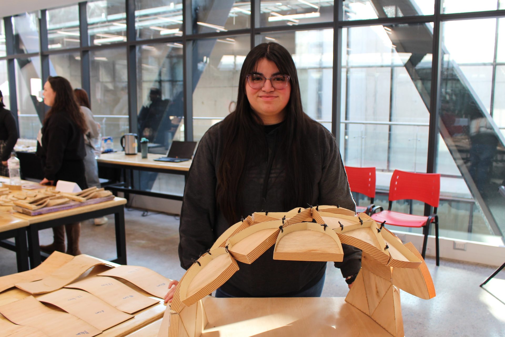 Natalia Burgos, profesora de la asignatura explica que “en este ciclo de experimentación, los estudiantes tuvieron que analizar un caso de estudio que utilizara fabricación digital en madera para su desarrollo. Vieron casos del área de la arquitectura, paneles acústicos, revestimientos flexibles, entre otros. Primero tuvieron que replicar a baja escala estos proyectos, y luego de entender los procedimientos para realizarlo, identificar variables que inciden en su diseño y modificarlas. Por ejemplo, cómo incide el grosor de la madera en el rendimiento de paneles acústicos, o cómo lograr que la madera se curve en la forma deseada utilizando diferentes técnicas”.