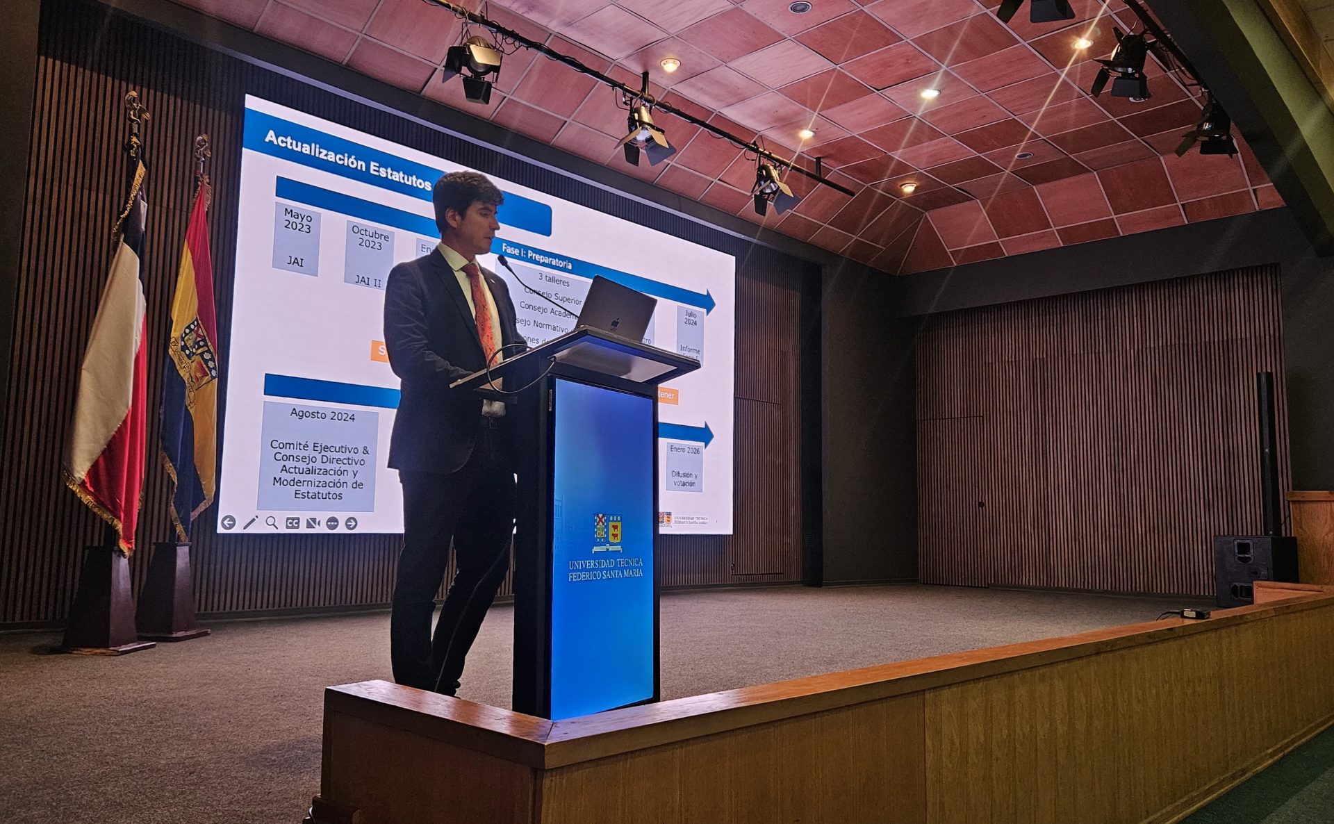 Carlos Quezada, exalumno recién titulado de la carrera de Ingeniería Civil Química, fue uno de los primeros en llegar al evento realizado en el Campus Casa Central Valparaíso, motivado por el deseo de participar y conocer el estado de la institución. “Me llama la atención saber cómo se están tomando decisiones en la universidad”, afirmó.