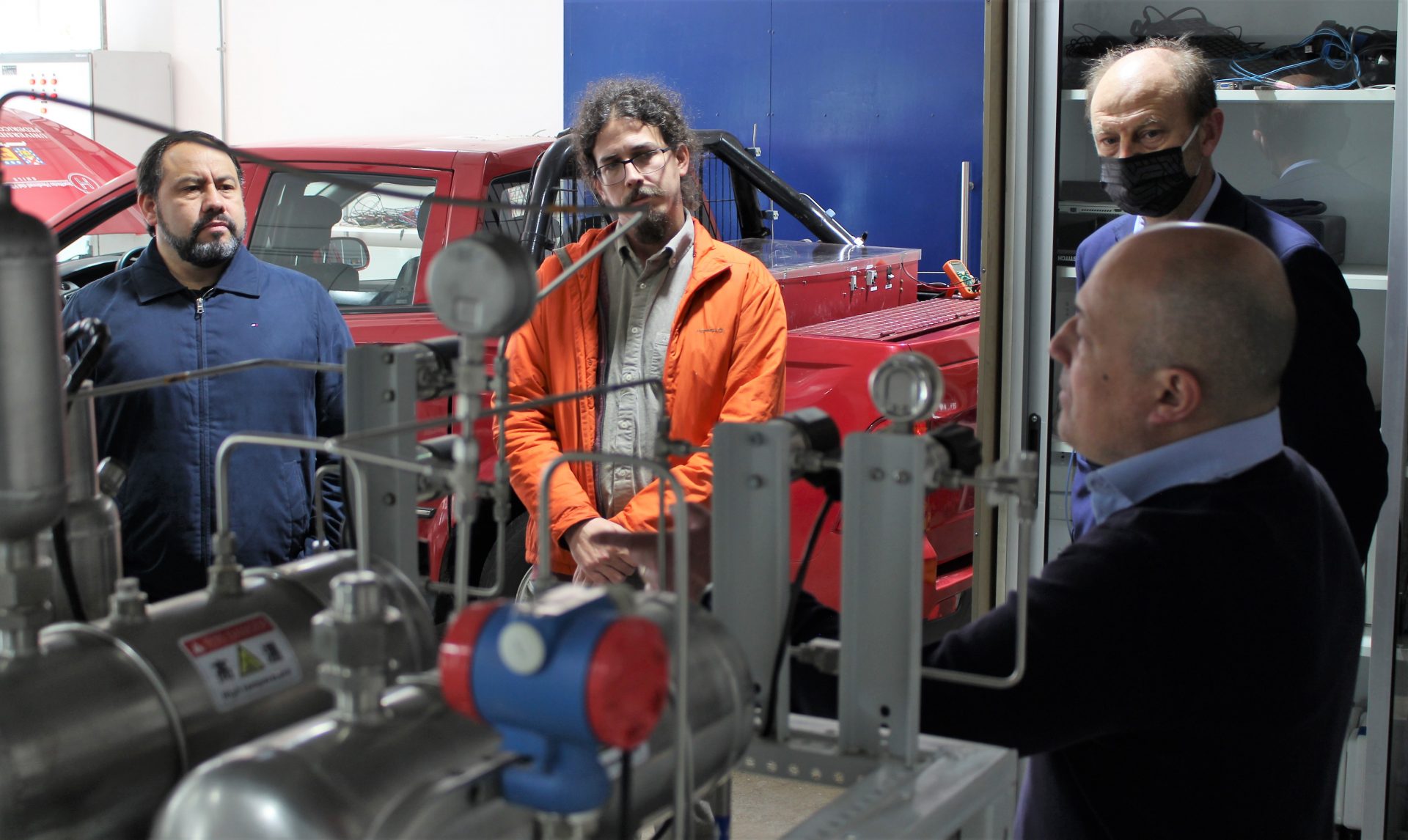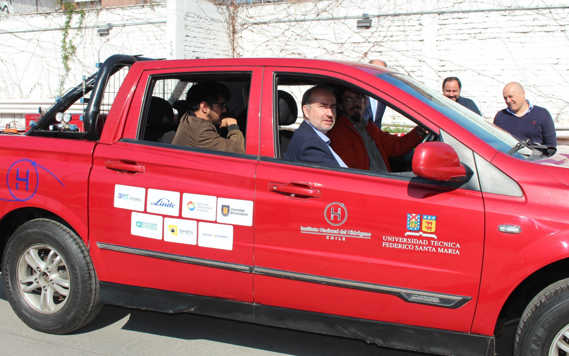 En este contexto, el presidente de EFE y el representante del ministerio, acompañados por René Espinoza, de la empresa Hydrox, y Alessandro Bozzo, gerente del Fondo de Garantía para Micro y Pequeños Empresarios (FOGAPE), conocieron la primera camioneta eléctrica movida por hidrógeno en Chile, desarrollada por la USM a través de un proyecto de investigación aplicada financiado por CORFO e Ingeniería 2030, que busca reconvertir una camioneta pick up diésel de uso minero en una eléctrica con funcionamiento a pilas de combustible.