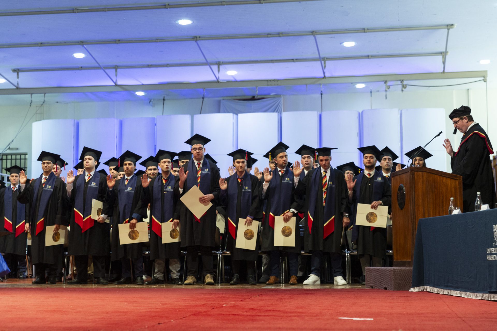 Luego de la entrega de los títulos a los nuevos técnicos universitarios e ingenieros de la USM, el secretario general de la casa de estudios, Jerome Mac Auliffe, tomó el juramento a los nuevos profesionales de la casa de estudios, sellando con ello su compromiso de servicio a la comunidad.