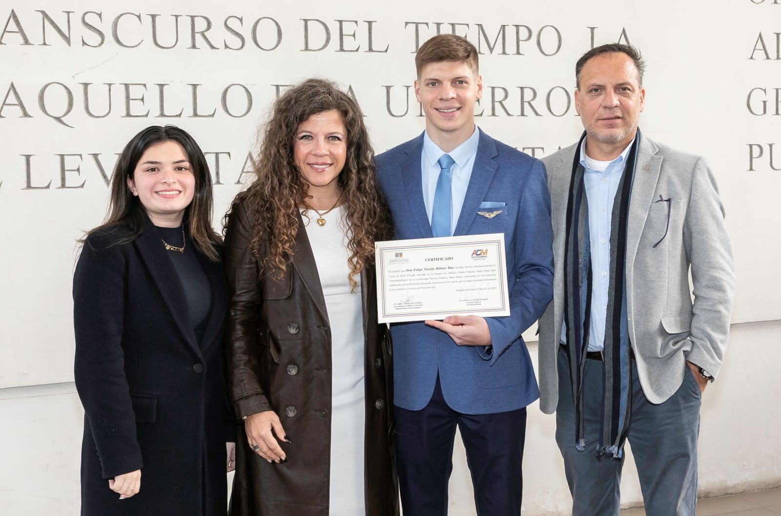 Posteriormente, el Director General de Asistencia Técnica de la USM en conjunto con la Directora del Departamento de Aeronáutica hicieron entrega del Diploma de Piloto Comercial con Habilitación de Vuelo por Instrumento, obtenido por cinco sansanos, y del Certificado de aprobación del Curso de Formación de Piloto Comercial, alcanzado por diez estudiantes.