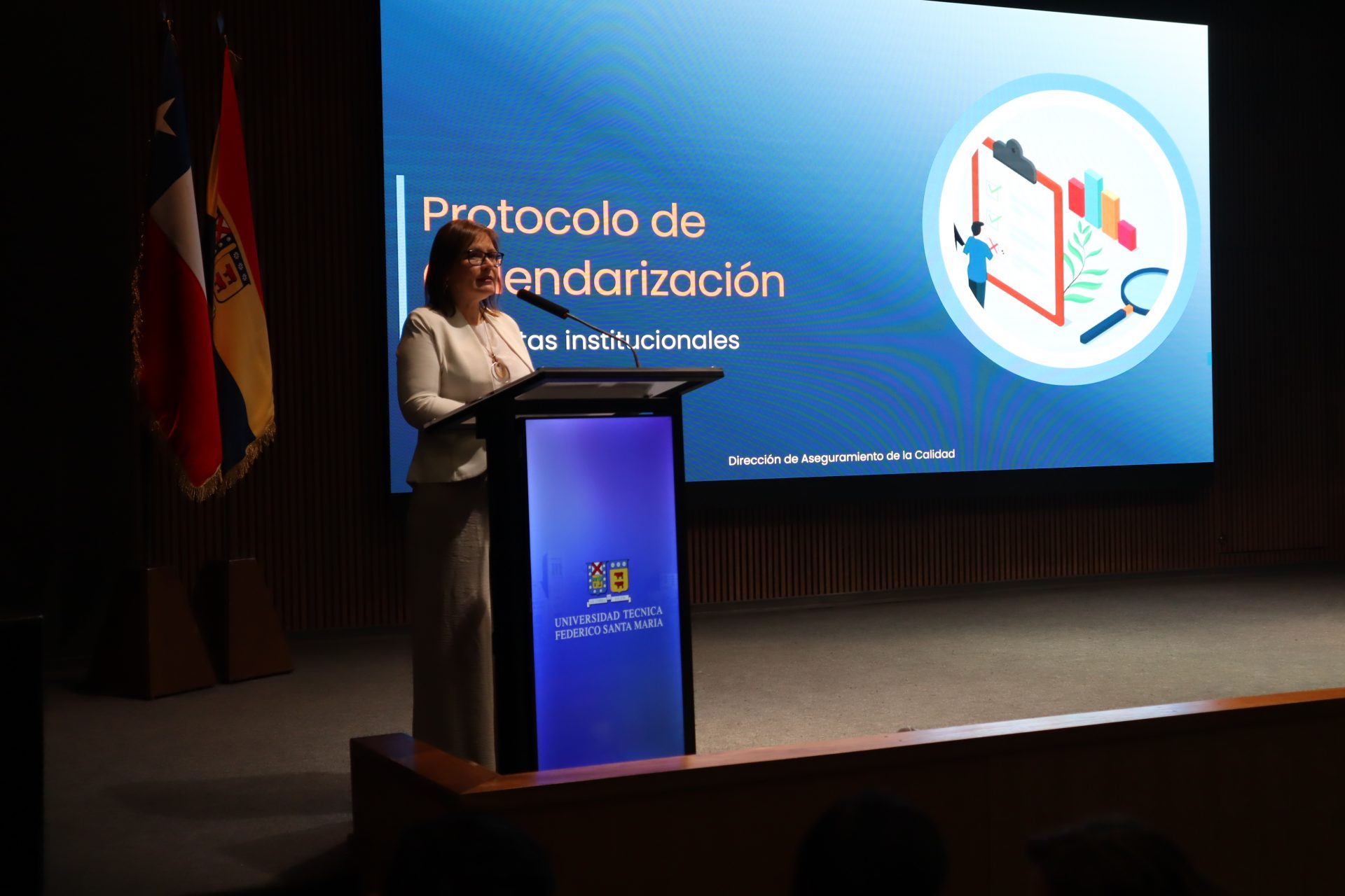 La presentación del protocolo en el Salón de Actos del Edificio T del Campus Casa Central Valparaíso de la USM contó con la participación de Patricia Ruiz, encargada de planificación y gestión de la calidad de la Dirección de Aseguramiento de la Calidad de la institución, y Natalia Riveros, profesional de estudios institucionales de la Dirección de Planificación y Desarrollo de la casa de estudios, quienes explicaron el contexto de la elaboración del documento, así como sus objetivos, alcance, marco normativo, responsabilidades, lineamientos y criterios para la aprobación de encuestas y el procedimiento de calendarización.