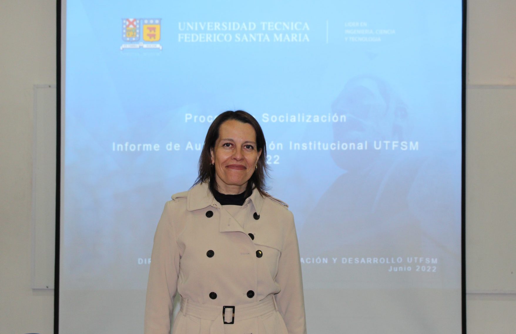 La presentación estuvo a cargo de la Directora General de Planificación y Desarrollo de la USM, Irene Ortega, quien explicó a los presentes que “la ley obliga a las universidades estar acreditadas, y la Universidad tiene una trayectoria de acreditaciones anteriores. Este es el cuarto proceso, y uno puede observar cómo se permea la mejora continua en la comunidad. Todos podemos hacer mejora continua”.