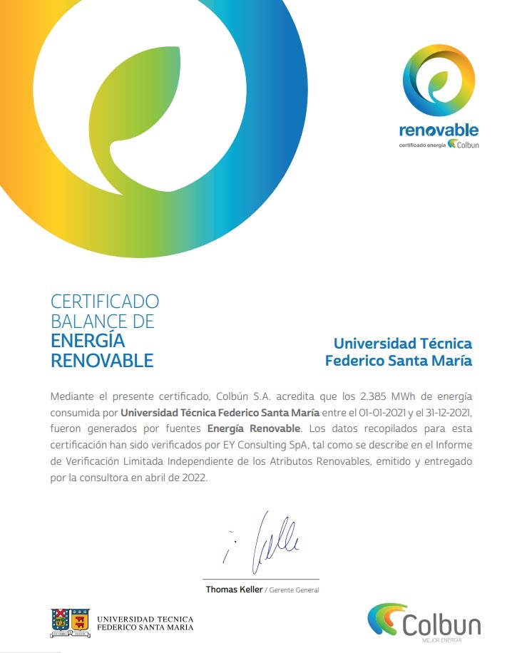 Esta certificación se entrega a partir de datos verificados por EY Consulting SpA, quienes emitieron un informe de validación independiente por los 2.385 MWh de energía consumida por ambos Campus de la USM, entre el 01 de enero y el 31 de diciembre de 2021.